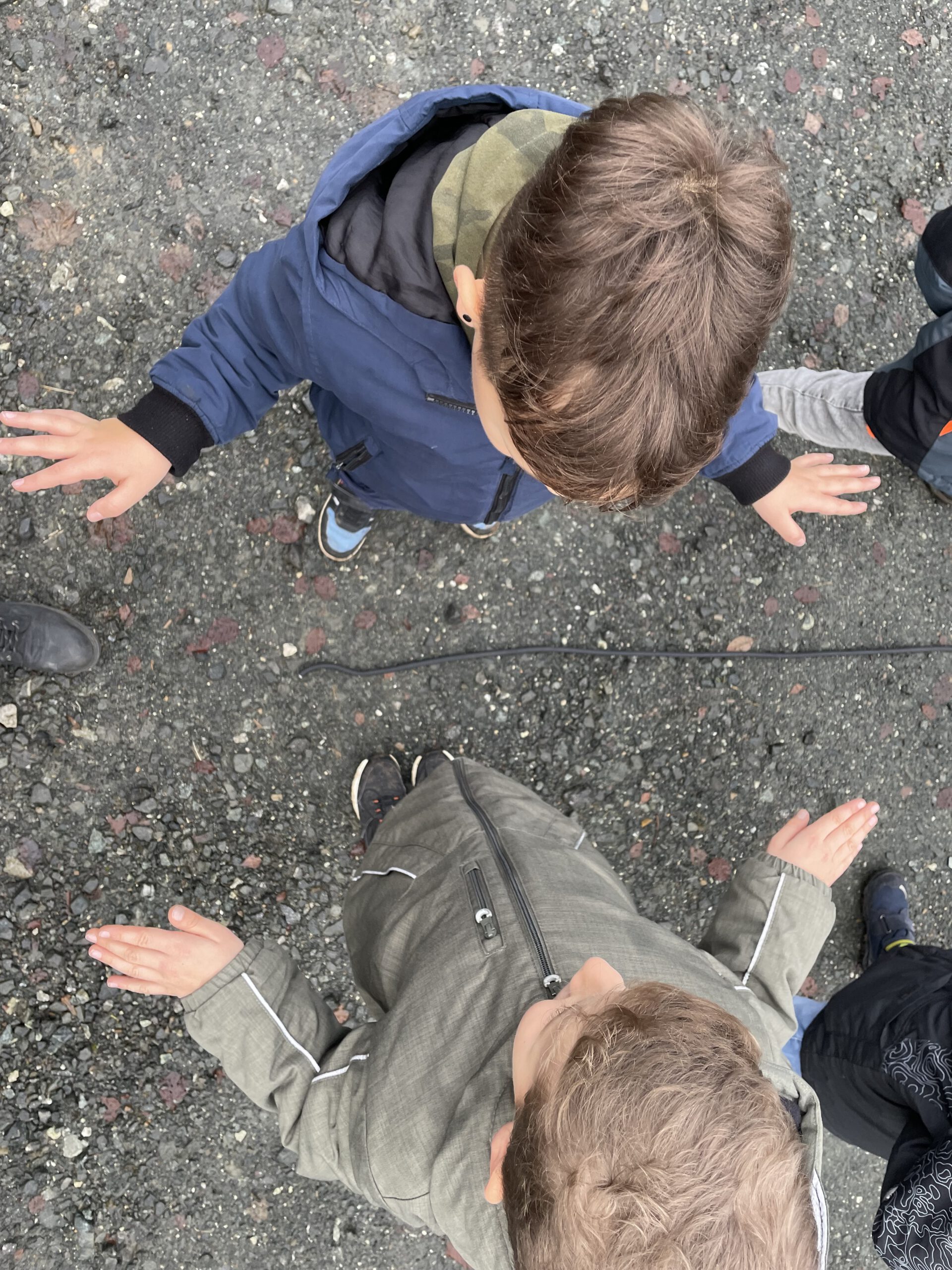 Außerdem ist es uns gelungen, Symmetrie nicht nur zu zu beobachten, sondern sie auch sichtbar zu machen: Mit Hilfe eines Seils legten wir unsere Spiegelachsen fest. Dann stellten wir uns in symmetrischen Figuren, wie auf den Bildern zu sehen, auf. So konnten wir sehen, wie beide Seiten zusammenpassen.