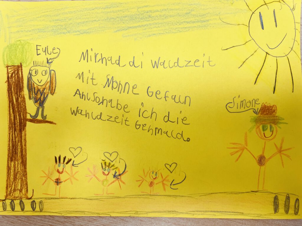 Die Waldzeit der Fuchsklasse zum Thema „Wortarten“ starteten wir mit einem kleinen Spaziergang. Auf der Freifläche angekommen, gestalteten wir verschiedene Gesprächsrunden zu den einzelnen Wortarten, thematisch angepasst an die Jahreszeit Winter. Wir überlegten, wie der Winter ist (Adjektive), was wir im Winter tun können (Verben) und welche Nomen uns zum Winter einfallen. Danach beendeten die Kinder aus der zweiten Klasse die Waldzeit mit dem Legen und Finden von Sätzen, passend zu den Wortarten.